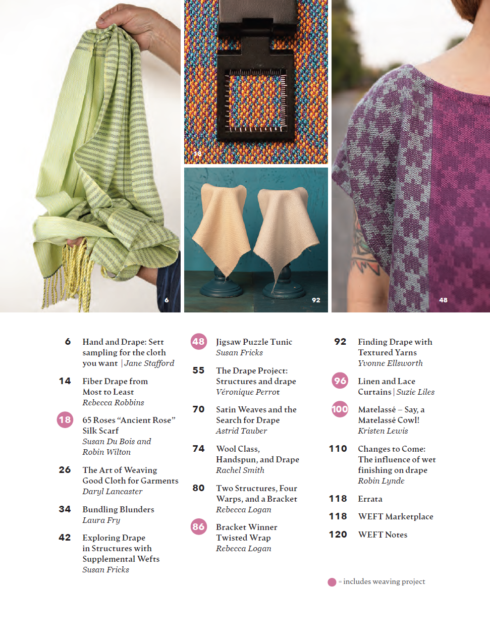We have projects that undulate and flow and even one project that sways the other direction – a no-puddle cowl. Every article and project in this issue is worth your time, and like every issue of WEFT we hope you’ll find yourself coming back to it again and again.